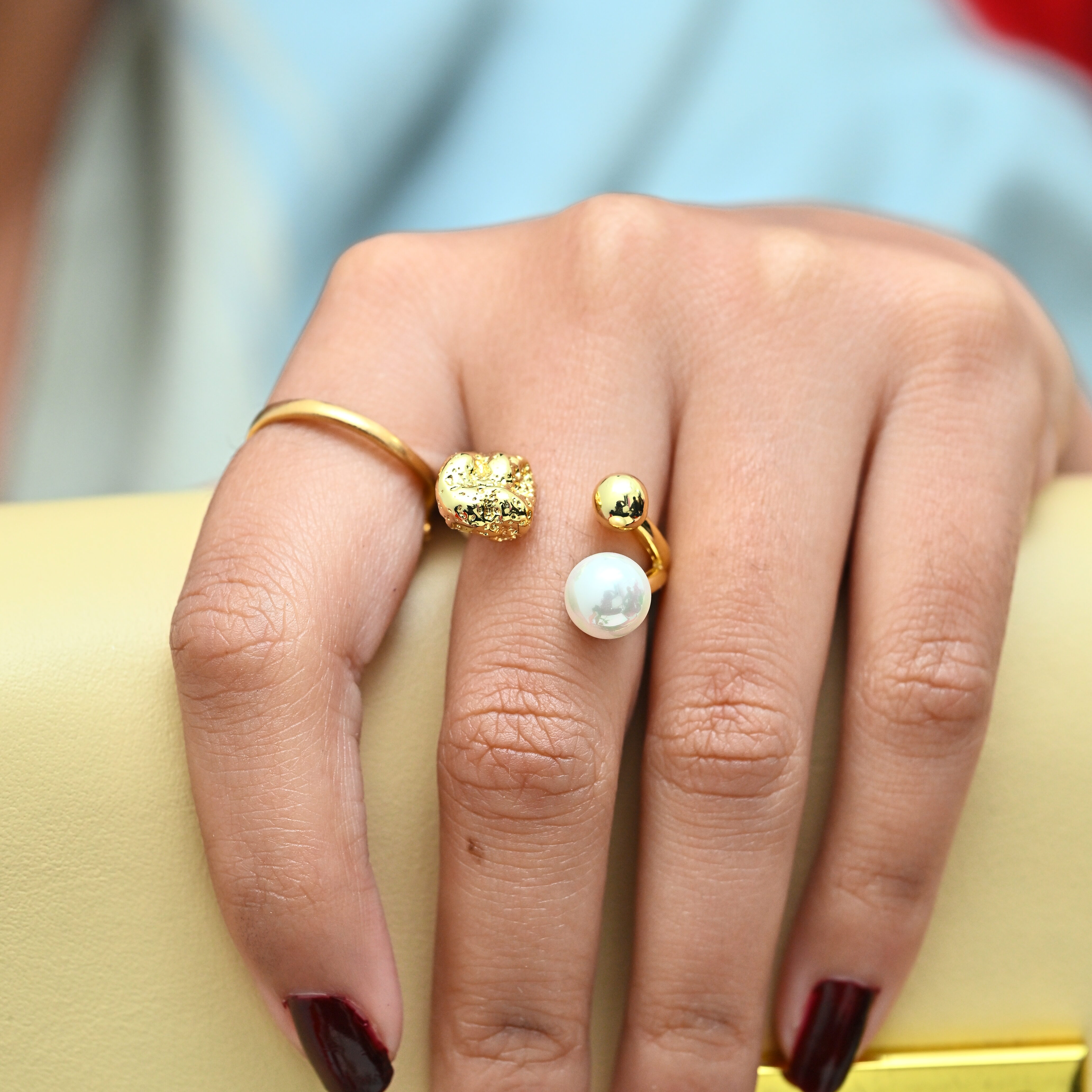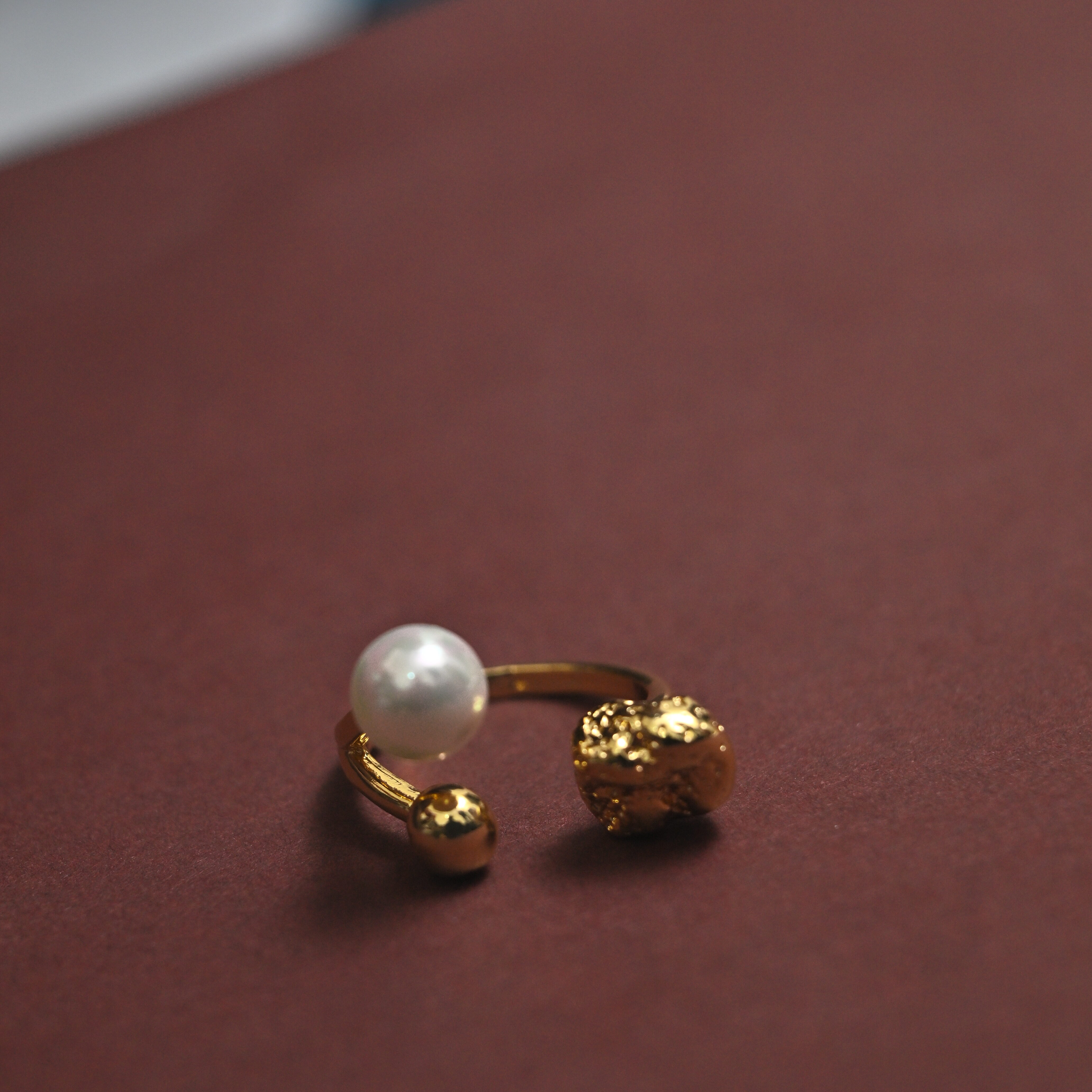 A sculptural gold ring with a pearl centerpiece, evoking the beauty of the sea. The textured gold detail resembles coral, making this piece a tribute to underwater wonders.